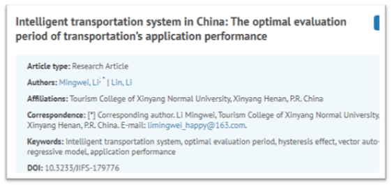 近日,英国上市公司365李明伟博士在SCI期刊《Journal of Intelligent and Fuzzy System》期刊上发表题为“Intelligent Transportation System in China: the Optimal Evaluation Period of Transportation’s Application Performance”的学术论文。