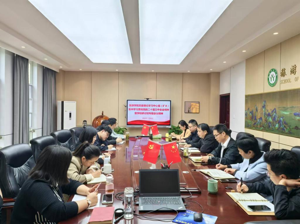 会上,雷前龙全文传达并学习了公司党委书记王文鹏在研讨班上作的专题辅导报告内容和讲话精神,强调我们要将党的二十届三中全会精神与学院的日常教学、科研和管理等工作紧密结合,进一步深化对会议精神的理解和把握,全面学习领会学校“123344”工作思路和改革举措,结合学院实际,夯实旅游管理学科水平和社会服务能力,助力学校高水平师范大学建设目标。