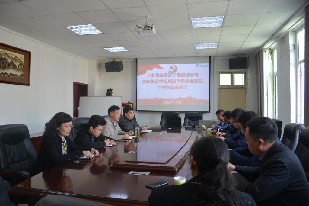 2021年4月11日,河南牧业经济学院旅游公司经理王德静、书记李喜民一行7人,来我校旅游学院进行专业建设调研交流,公司旅游公司经理彭荣胜、副经理郭军升、旅游系系主任吴国琴、酒店系系主任江晓晗一同出席了专业建设交流会。